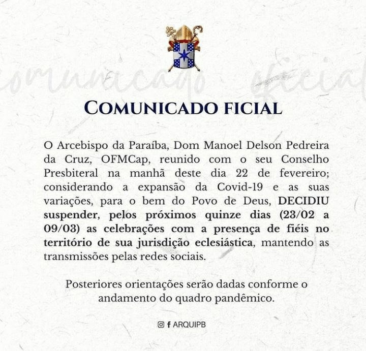 O arcebispo da Paraíba, Dom Manoel Delson Pedreira da Cruz, informou que decisão foi tomada em reunião com o Conselho Presbiteral e levou em consideração o aumento dos casos de Covid-19 na Paraíba, além das variantes do vírus que têm aparecido no estado.