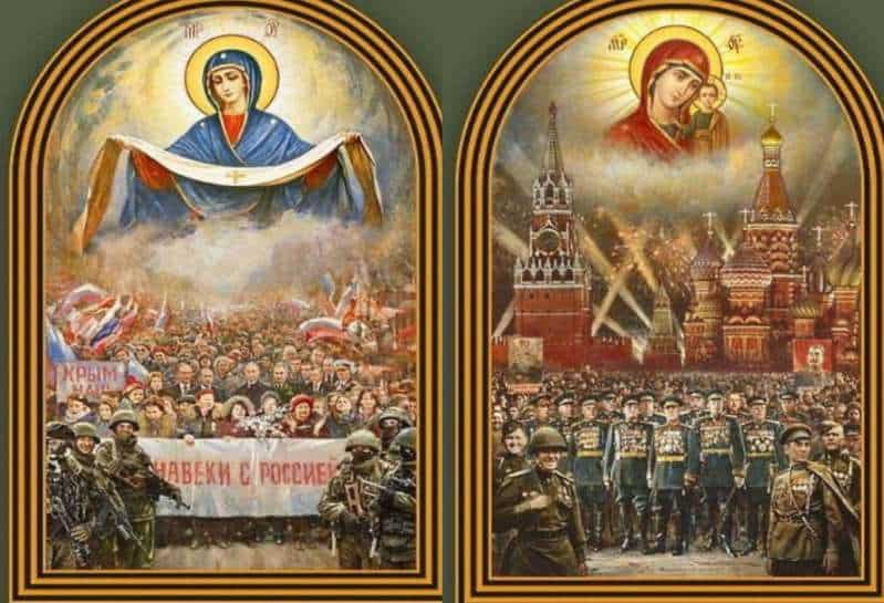 A Igreja Ortodoxa Russa construiu uma gigantesca catedral dedicada às forças armadas russas. O templo, que foi erguido nos arredores de Moscou, é uma glorificação do exército soviético, ornado com vitrais, mosaicos, símbolos referentes ao comunismo. Entre os painéis, a utilização maligna da imagem da Santíssima Virgem Maria para exaltar Vladimir Putin na invasão da Crimeia e uma abominação monstruosa: Nossa Senhora como uma espécie de “madrinha” do Exército Vermelho de Josef Stálin, uma máquina satânica genocida, responsável pelo assassinato em massa de cristãos (cf. imagem).