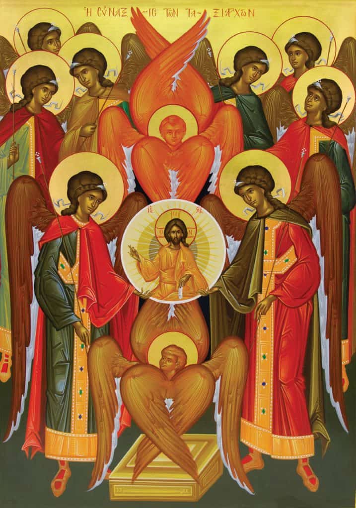 - Serafins, cujo nome significa “fogo”, e isso por duas razões: porque eles mesmos vivem abrasados de amor divino e porque transmitem aos espíritos inferiores um pouco de seu próprio ardor na caridade. São anjos “incandescentes”, voltados totalmente para a contemplação e adoração a Deus.